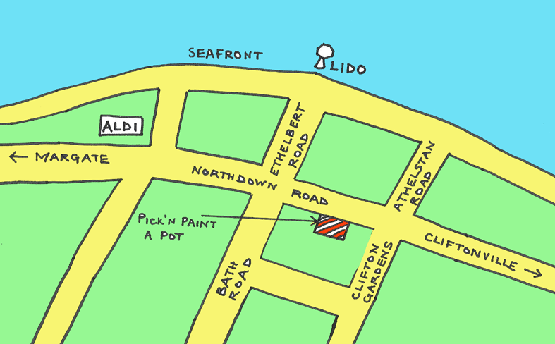 Pick 'n Paint a Pot is located on Northdown Road, the main shopping High Street in Cliftonville. The shop is at the Margate end of Northdown Road about half a mile from Margate Clock Tower and the sea front. There is limited parking outside the shop on Northdown Road for one hour, although most side roads off Northdown Road have unrestricted parking. The following buses run past the shop: Breeze 8 & the Thanet Loop. |